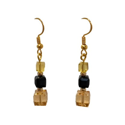 Add a touch of gold with our Graduated Square Trio Drop Earring. Black and Gold tones featuring 3 varying-sized square beads with gold spacers. Gracefully go between day and night. Brighten your day with a hint of gold.